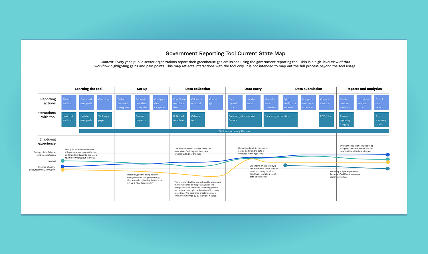 I led a service design initiative to visualize the reporting workflow and experience of public sector employees, shaping the decision-making for an emissions reporting tool.