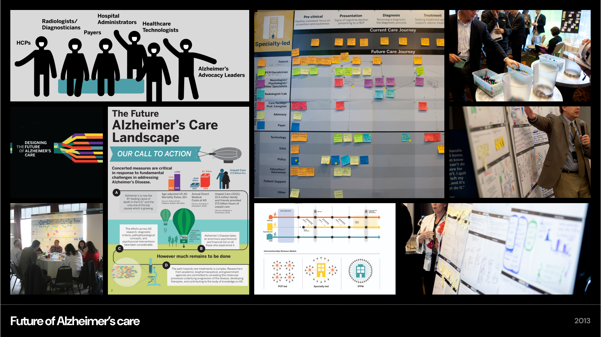With the launch of a paradigm-shifting Alzheimer’s medication on the horizon, there was an unknown question of how the Alzheimer’s care ecosystem might evolve in the US in the next 5-10 years. As a core team designer, I helped visualize three plausible care models and facilitated two workshops that brought together a diverse group of advisors including national specialists, leading primary care doctors, advocacy leaders, payers, entrepreneurs, and members of the client team to co-create how those scenarios might play out in reality. By iterating on the proposed care models with different expert groups, the project team was able to refine each future scenario and align our client's internal stakeholders to a shared vision of the future. Outputs from the co-creation guided the ongoing brand, business, and tactical planning roadmap.