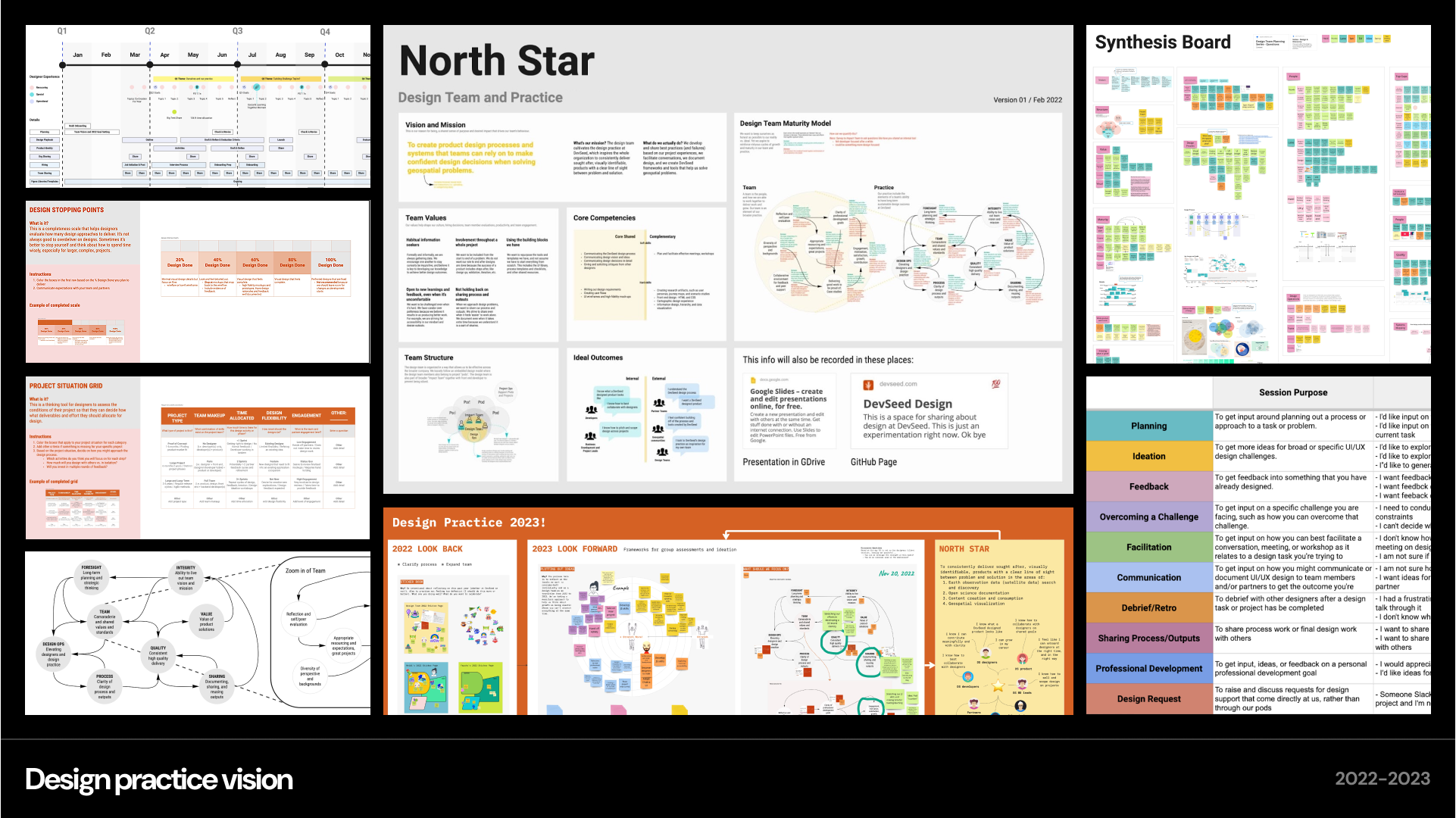 Product designers are usually embedded within development teams in order to collaborate cross-functionally. This is generally a good thing, but it does come with challenges. A common challenge is maintaining enough collaboration amongst designers and building up a design practice. I had the opportunity to work remotely with three designers across different time zones. We didn’t work on the same projects so it was hard to share a common vision and goals. To improve our sense of togetherness, I spoke with each designer about their experience and drafted several iterations of a design team vision that we could build together. The output included written statements on a vision, mission, team values, core competencies, team structure, ideal outcomes, and a maturity model for growth. This became the backdrop for more concrete goal setting each year. For two years, we consistently held weekly design collaboration sessions and worked towards several shared design practice goals.