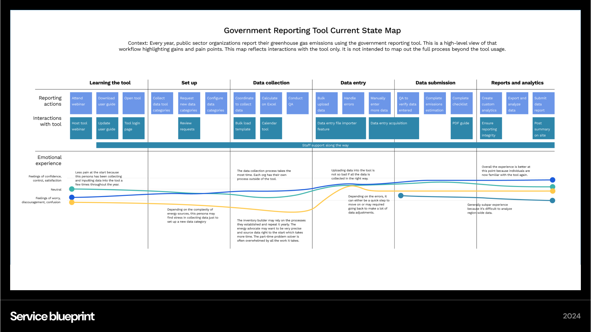 As a long-term effort to achieve carbon neutrality, a regional government required that public sector organizations report yearly greenhouse gas (GHG) emissions. Yet the process of reporting was difficult for organizations that lacked dedicated staff and resources to do this kind of detailed reporting. I was contracted by the government as a service designer to learn about, and visualize, the reporting workflow and experience of public sector employees using the emissions reporting tool. It was my responsibility to detail out my specific contribution within the broader program and develop a research plan with a discussion guide for conducting research. I tested the tool myself and reviewed past surveys. After leading the recruitment of 16 research participants and 10 workshop participants, I conducted the research and synthesized the data, resulting in a report, service blueprint, and executive presentation with recommendations. The final deliverable was a formal presentation to the broader government team.