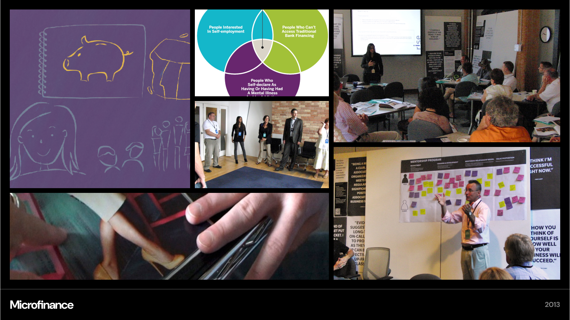 Microfinance is a form of financial loaning available to those who lack access to traditional banking services. However, building a microfinance organization to support entrepreneurs with mental illness and addictions comes with unique considerations. The number of clients taking on loans at one particular organization was dwindling and it was unclear why. They wanted to apply design thinking as a methodology to reimagine their service offering. As a designer on the project, I prepared visual assets for workshops and meetings, and supported the design of new service ideas based on research findings. Aspects of the organization were revised including restructuring program governance, customizing the communications, and refining an existing mentorship program to follow a more peer-to-peer model.