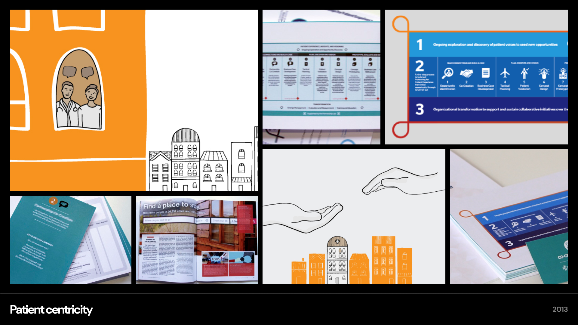 The US healthcare landscape was undergoing a shift towards value-based approaches to care where success would be measured around keeping a patient holistically healthy, rather than the current fee-for-service model. In practice, this would require a radical shift from the traditional way organizations think about patients. The project goal was to define patient centricity and develop an approach to patient engagement that could be implemented across an entire organization. My contribution as a designer included project branding and visual communications, as well as participation in research and synthesis, workshop design and facilitation, and the overall design and development of a strategic framework. The impact of the project led to over 30 patient initiatives. Most notably, it led to the development of an open source set of design principles and resources to help people communicate with patients about complex topics.