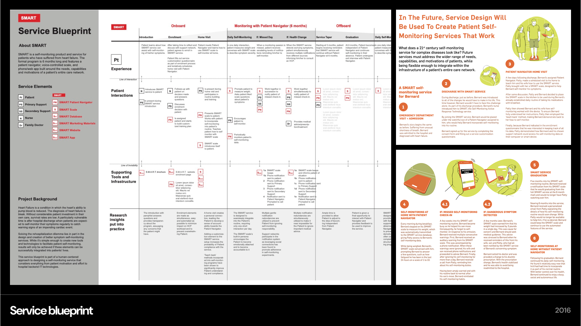 Patient self-monitoring of complex diseases is a healthcare issue that deserves more attention as patients who must self-monitor their own symptoms are often not set up for success. Failures in self-monitoring can lead to high readmission and mortality rates, driving high costs to the healthcare system. I collaborated with a biomedical communicator to research and propose a new self-monitoring service. This service reimagined how we might address the wider range of needs, capabilities, and motivations of patients with today’s standard self-monitoring procedures, while being flexible enough to integrate within the infrastructure of a patient’s entire care network. A service blueprint along with a pitch booklet was created and shared out as a way to inform about this particular issue and demonstrate the service design process.
