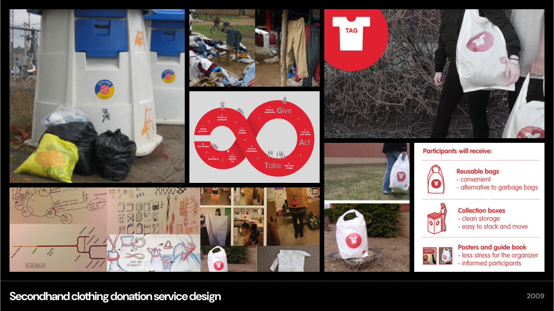 Dropping off used clothing into a charity bin is generally considered to be an act of goodwill. Yet people are not always aware of the business of reselling old clothes at a mass scale. As my undergraduate thesis, I proposed a project to understand the local and global journey of secondhand clothes, and designed a clothing donation service that would promote a more dependable and socially-minded way of donating old clothes. The solution that was called Take. Act. Give. (T.A.G.) would equip large group organizations (i.e., offices, community centres) with a donation kit that allows local organizers to easily run an effective clothing drive for a specific charity organization where they know exactly what happens to the clothes. The kit would include reusable bags, temporary collection boxes, along with posters and educational materials. This project won the industrial design program medal and top prize at the Association of Chartered Industrial Designers of Ontario’s (ACIDO) annual Rocket Industrial Design Competition. It was also displayed at the Socially Responsible Design Exhibit at Toronto Pearson International Airport.