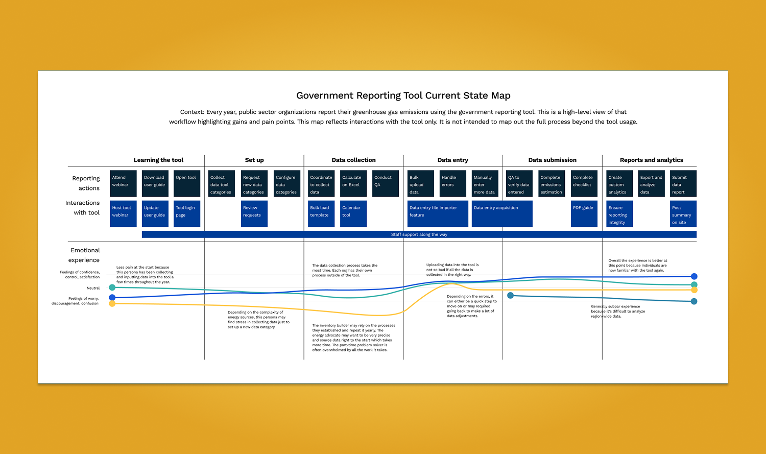Provided service design consulting in the public sector by analyzing a tool for regional emissions reporting, interviewing both local government and public sector organizations to translate reporting workflow steps into clear, actionable insights for government decision-makers on the future direction of the tool. Read more →